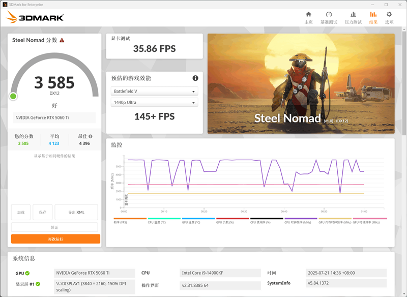 In the Steel Nomad test for reliability, stability, and sustained performance in 3Dmark, the total score is 3585, with a graphics card test score of 35.86FPS.