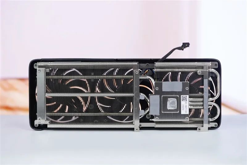 The full view of the Cold Wing Ice Vein cooling matrix cooler of the Maxsun GeForce RTX 5060 Ti iCraft OC 8GB graphics card. Both the GPU and VRAM chip positions have thermal grease and thermal adhesive strips, which can quickly transfer chip heat to the three composite heat pipes through the nickel-plated copper base, and finally efficiently dissipate heat on the high-density heat sink fins.