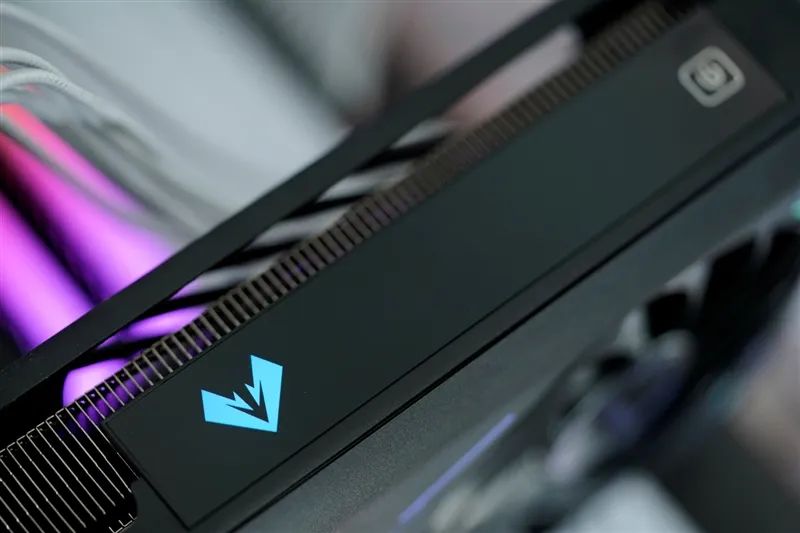 Close-up of the 11-blade cyclone ring fan. The carefully designed blades reduce turbulence loss, improving airflow and pressure performance by 20%. High-end imported ball bearings are used internally for better noise control. The three fans use a positive and negative rotation design, and the middle fan is also equipped with a carbon fiber decorative ring.