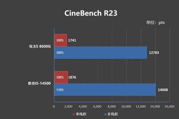 Despite having more cores, under the common 65W power consumption in OEM business machines, the i5-14500 was merely 10% stronger than the Ryzen 5 8600G in CineBench R23, a test fully leveraging multi-core performance.
