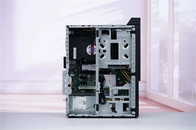 Removing the side panel reveals the internal layout of the chassis.