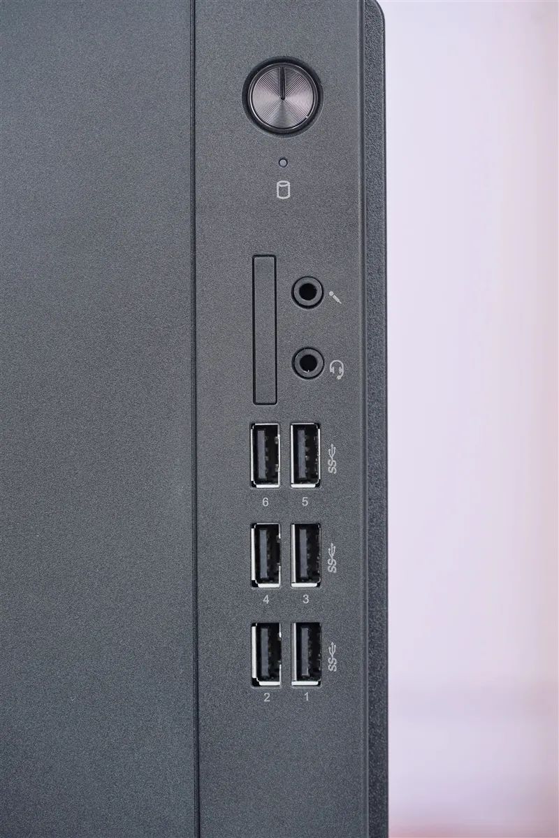 The front I/O interfaces include 2 3.5mm audio ports and up to 6 USB 3.0 ports.