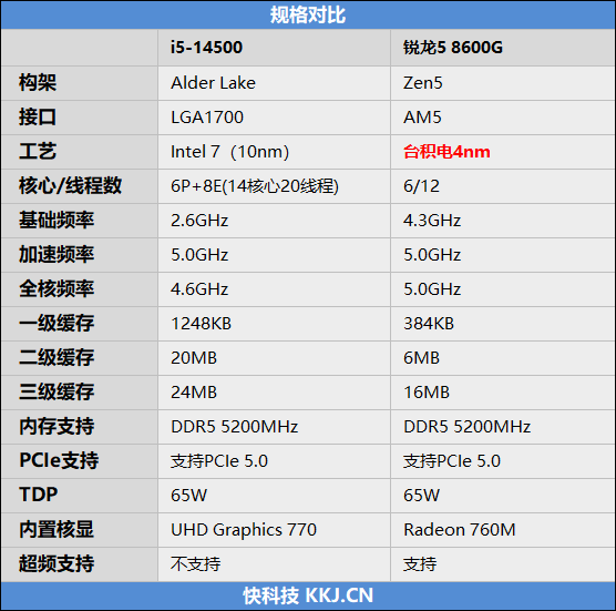 However, a crucial aspect to consider is the difference in their manufacturing processes. The i5-14500 employs Intel 7 (actually 10nm), whereas the Ryzen 5 8600G uses TSMC's 4nm process, over two generations ahead.