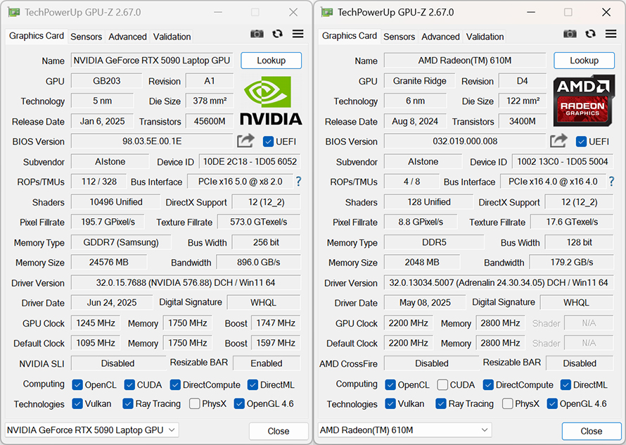 The other flagship is the GeForce RTX 5090 Laptop, also unveiled at CES. Based on the latest Blackwell architecture, it boasts 10496 CUDA cores with an official accelerated frequency adjustable between 1597-2160 MHz. It comes with 24GB of GDDR7 memory, a memory bandwidth of 896GB/s, and supports DLSS 4 and Reflex 2 new technologies, with an AI computing power of 1824 TOPS. According to GPU-Z, the GPU accelerated frequency of the Canglong 16 Ultra is 1747Mhz.