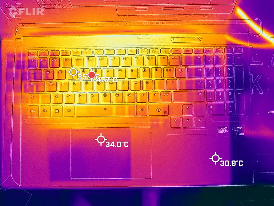 Starting with the heat test, we used the FLIR ONE Pro to measure the temperatures of the laptop's C-surface, the air exhaust vents, and the water cooler exhaust vents. The temperature recorded on the C-surface, near the center of the keyboard, was 47.7°C.