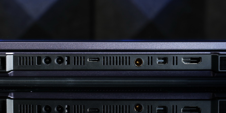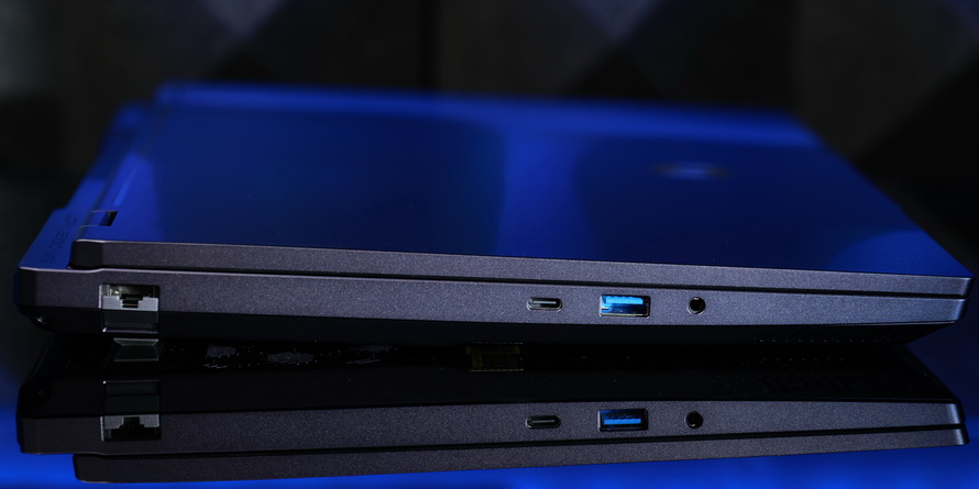 In terms of ports, the Mechanical Revolution Canglong 16 Ultra provides multiple ports on both sides and the back. The back includes a water cooling port, a round power port, USB-C (10Gbps+PD 140W proprietary protocol+DP1.4), MINI DP2.1, HDMI 2.1. The left side has an RF-45 network port, USB-C (10Gbps+PD 100W+DP1.4), USB-A (5Gbps), and a 3.5mm combo audio jack. The right side has dual USB-A (5Gbps) ports and a Kensington security lock. The variety and quantity of ports are abundant, with the slight regret of not providing a 20/40Gbps USB-C port.