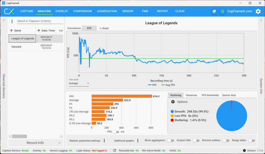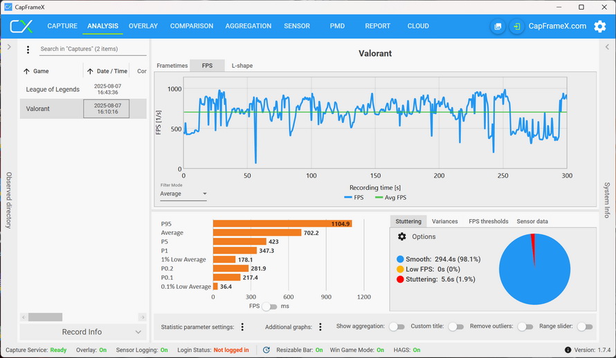 For the two games without benchmarks, "VALORANT" and "League of Legends", we used CapFrameX to monitor and count the game frame rates. The average frame rate in "VALORANT" was 702.2FPS, and the P95 frame rate could reach 1104.9FPS.