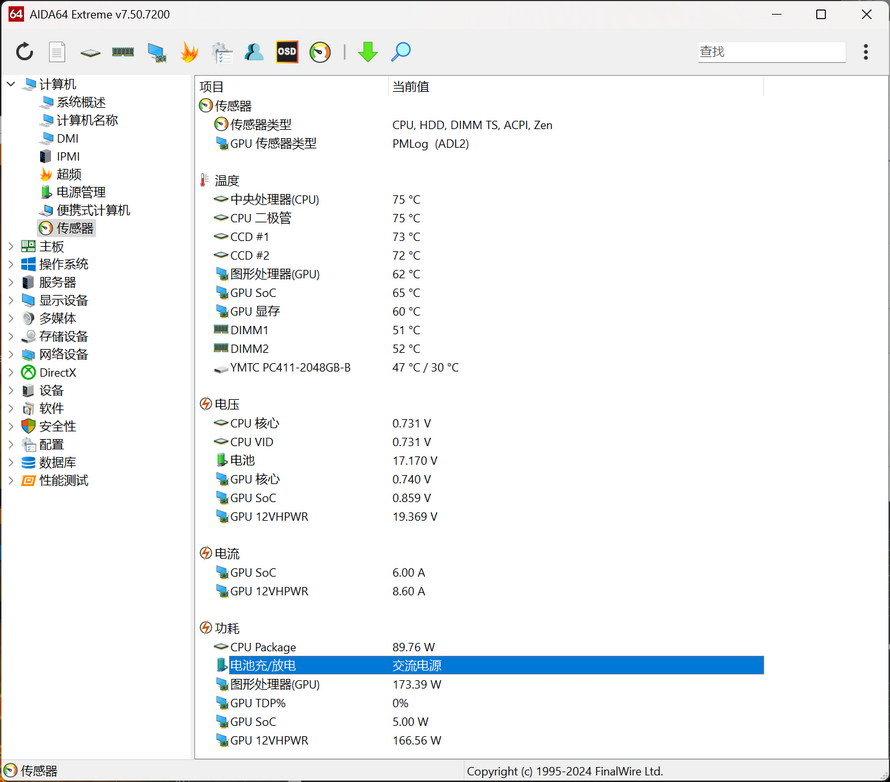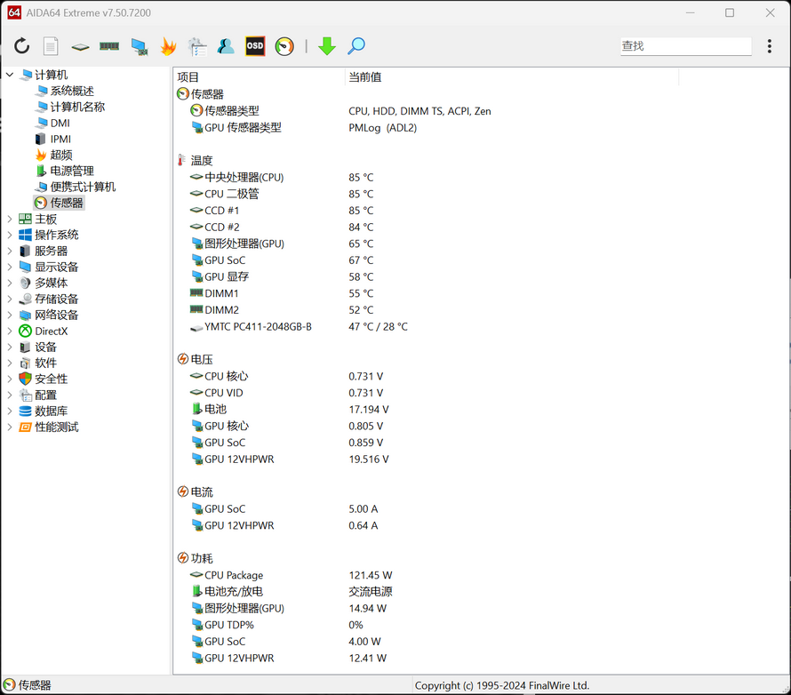 We also tested the laptop's single-load power consumption. When using AIDA64 to stress test the CPU alone, the CPU power consumption can reach 121.45W, slightly higher than the official claim of 120W.