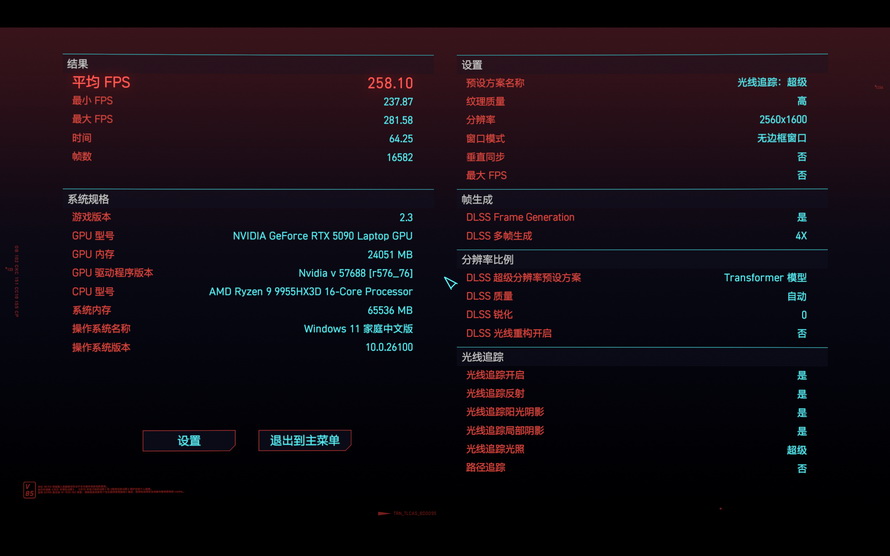 The third game is "Cyberpunk 2077". Based on the game's recommended settings—a resolution of 2560*1600, DLSS 4X enabled, and ray tracing enabled—the specific settings can be referred to in the image below. The average frame rate was 258.10FPS, with a minimum of 237.87FPS and a maximum of 281.58FPS.