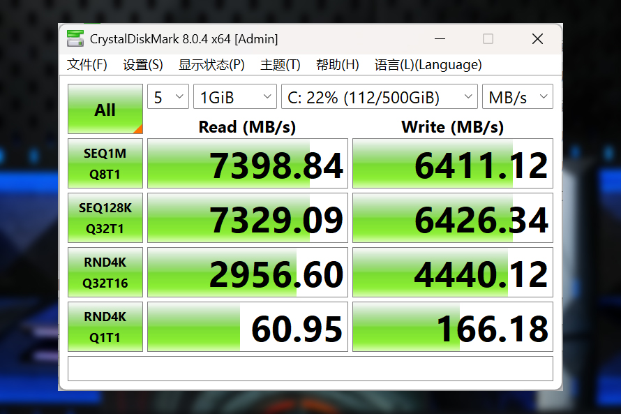 Next is the SSD performance test. The CrystalDiskMark measured read speed reaches 7398MB/s, and the write speed is 6411MB/s, which is a good performance.