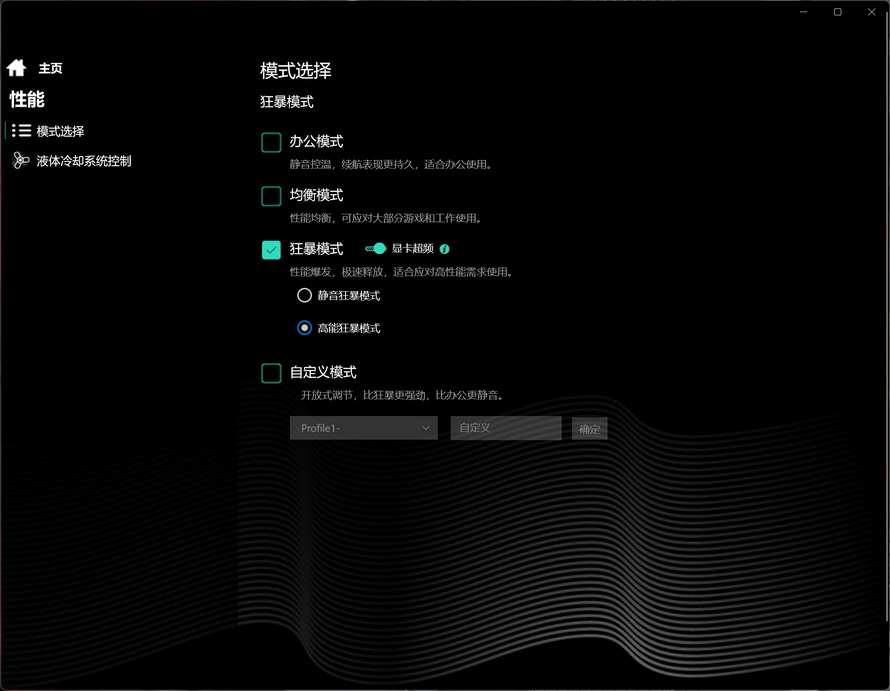 The Mechanical Revolution Control Center can be considered the computer's control hub, allowing users to control lighting effects, display settings, battery, and performance. Among these, performance is undoubtedly the most important. The performance menu is divided into mode selection and liquid cooling system control.