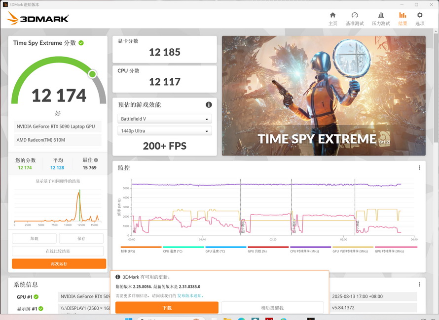 Next, we start the game testing. The first "game" is, of course, the 3DMARK. In Time Spy Extreme, the Mechrevo Canglong 16 Ultra scored a total of 12174, with a graphics card score of 12185 and a CPU score of 12117.