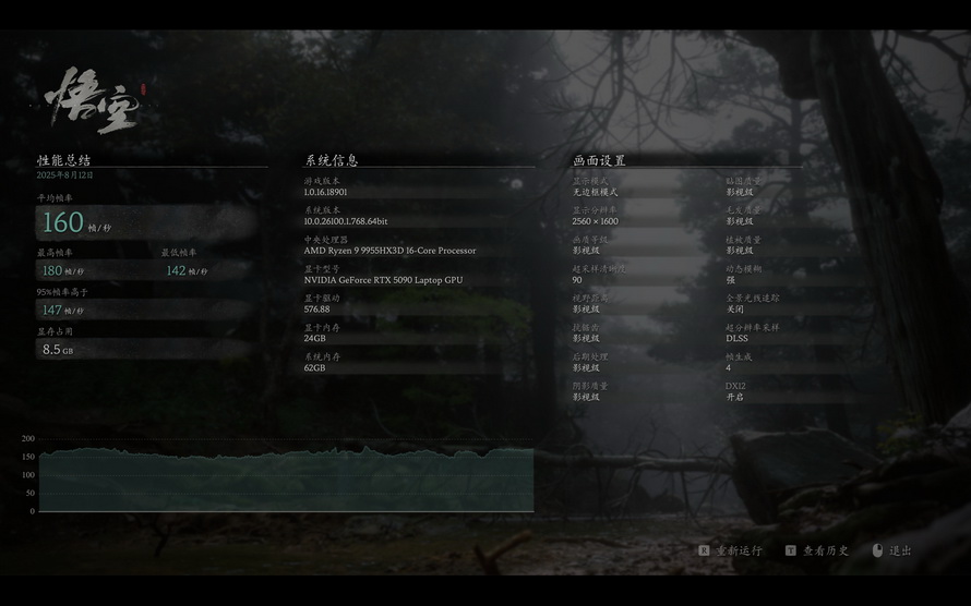 The second game is the well-known domestic 3A masterpiece "Black Myth: Wukong". Using the in-game testing tool, at a resolution of 2560*1600, with cinematic graphics settings, supersampling clarity of 90, DLSS 4 enabled, and high-level panoramic ray tracing, the average frame rate was 94FPS, with a maximum of 112FPS and a minimum of 78FPS. 95% of the frame rates were above 81FPS. After disabling ray tracing, the average frame rate increased to 160FPS, with a maximum of 180FPS and a minimum of 142FPS, and 95% of the frame rates were above 147FPS, which is quite impressive.