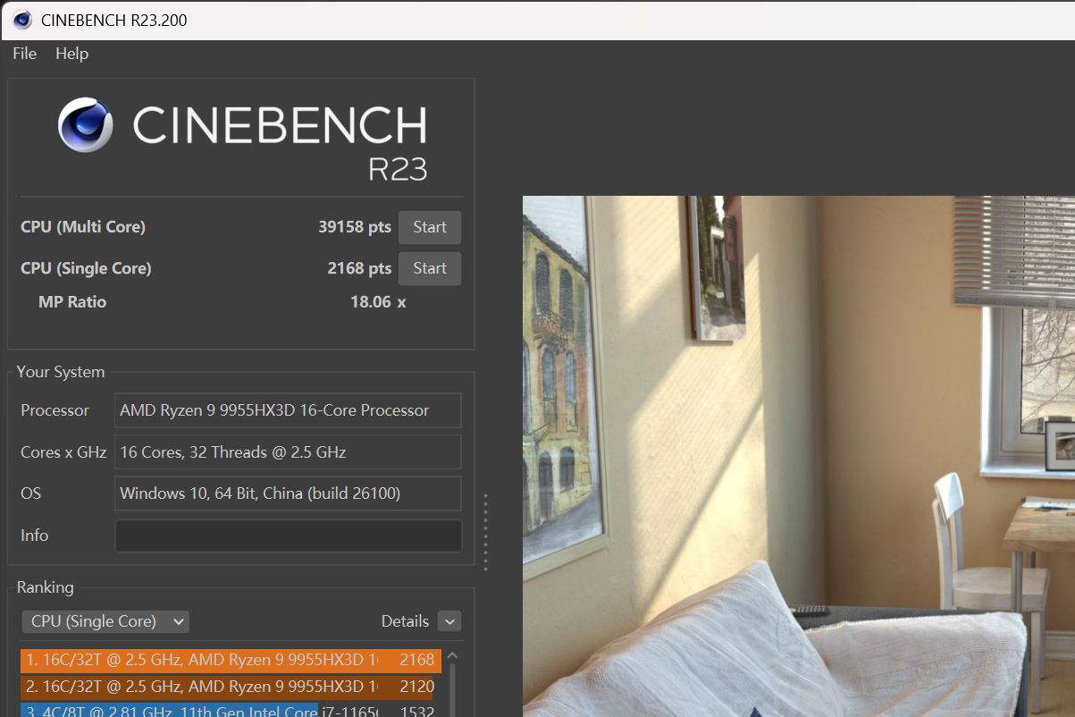 The third test is the CPU performance test. In CINEBENCH R23, the Mechrevo Canglong 16 Ultra achieved a multi-core score of 39158pts and a single-core score of 2168pts, which are very impressive results.