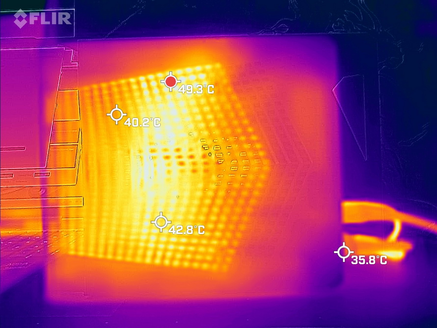 Finally, we measured the temperature of the water cooler exhaust vent, which had an overall temperature of 40°C+, with a high temperature of 49.3°C.