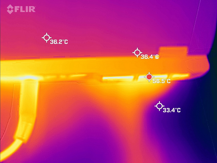 Next, we measured the temperature of the air exhaust vents at the back of the laptop. Since there is an exhaust vent on each side of the laptop, we chose the vent closer to the 47.7°C hot spot for measurement, recording a high temperature of 56.5°C.