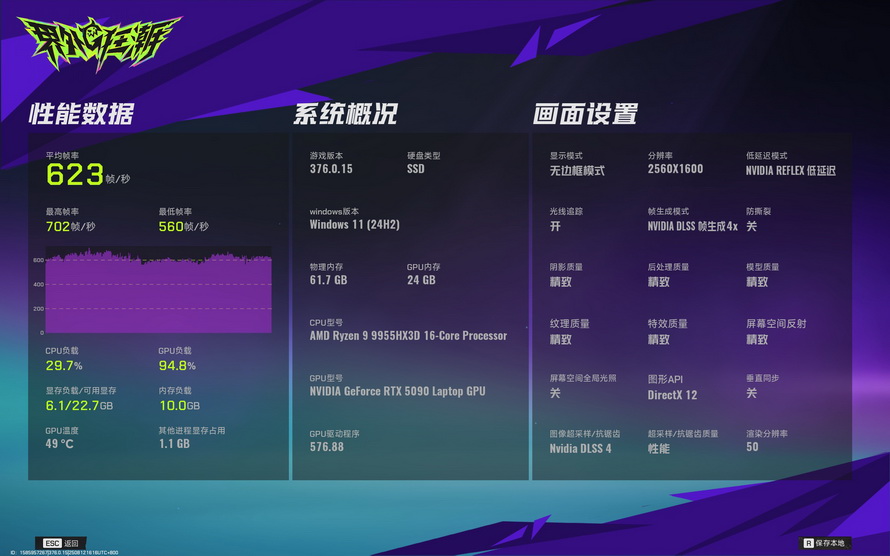 In addition to 3A masterpieces, we also tested the performance of the Mechrevo Canglong 16 Ultra in online games, as its AMD Ryzen 9 9955HX3D processor boasts "thousand-frame e-sports" performance, which is naturally very much anticipated. In "Boundless", published by NetEase, at a resolution of 2560*1600, with DLSS and ray tracing enabled, the average frame rate reached 623FPS, with a minimum of 560FPS.