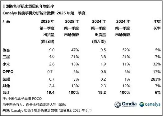 Canalys data shows that in the third quarter of 2024, smartphone shipments in the African market reached 18.4 million units, a year-on-year increase of 3%. Market research agency data shows that in the first quarter of 2025, overall smartphone shipments in Africa increased by 6% year-on-year, totaling 19.4 million units.