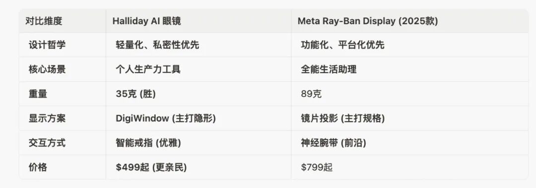 This leads to a significant divergence in product form: Halliday resembles a focused 'AI secretary,' providing precise assistance only when needed; while Meta acts more like an all-powerful 'AI companion,' attempting to handle every aspect of your interaction with the world.