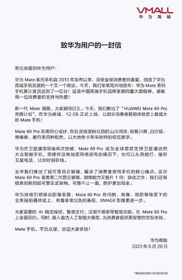 On August 29, 2023, Huawei Mall released "A Letter to Huawei Users," announcing that the Mate 60 Pro would go on sale at 12:08 PM, "allowing some consumers to experience the most powerful Mate smartphone ever."