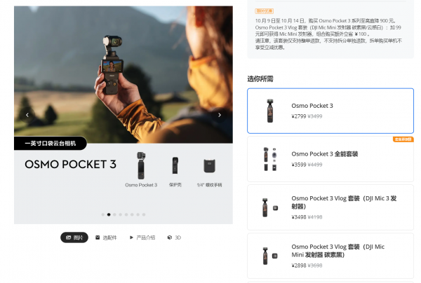 Analyzing the specific products in this round of price cuts, DJI's reductions from October 9 to October 14 are substantial: the Pocket 3 Standard Edition drops by 700 yuan (3,499→2,799 yuan), the Action 4 by up to 1,129 yuan, and the Mini 4 PRO by 1,478 yuan.