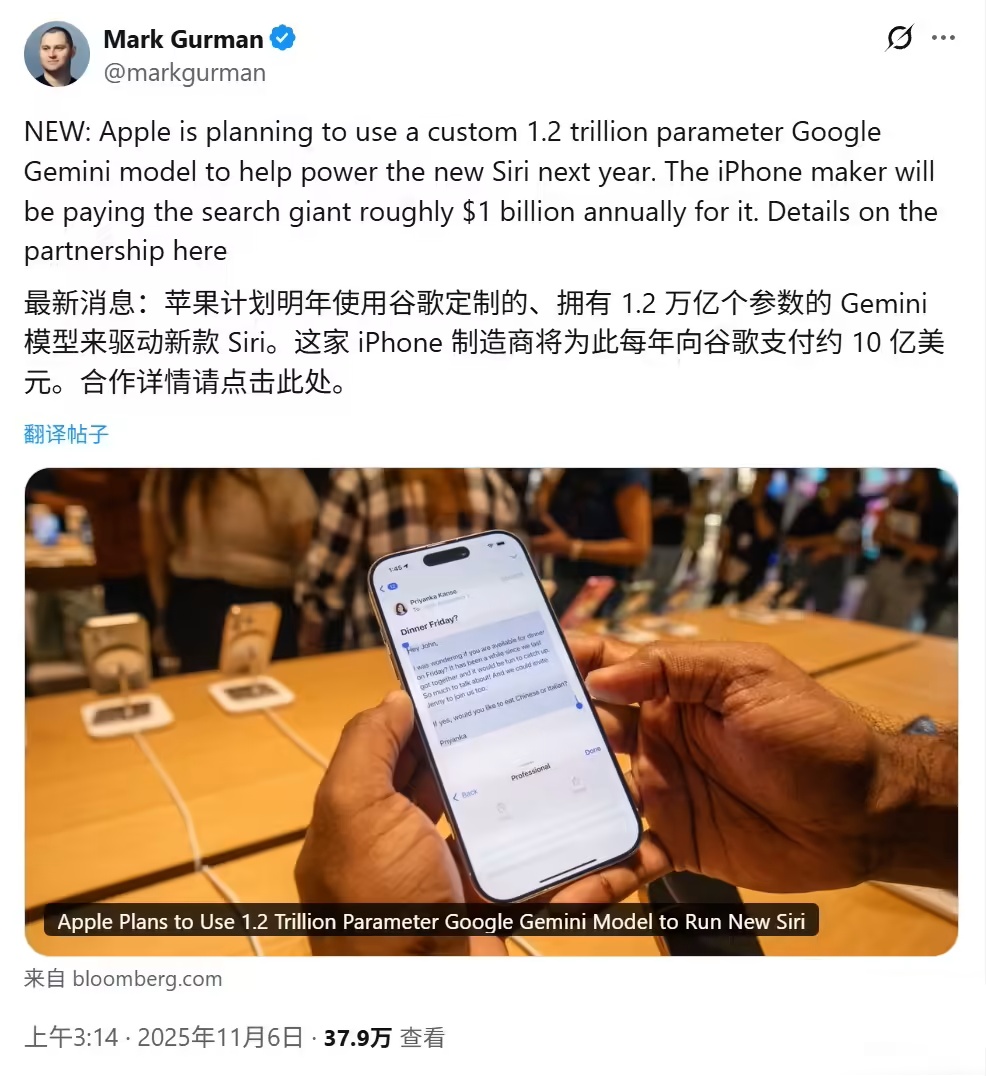 On November 6th, Bloomberg's Mark Gurman reported that Apple is gearing up to incorporate Google's Gemini large model to power its technical infrastructure, aiming to make the new iteration of Siri smarter and more robust.
