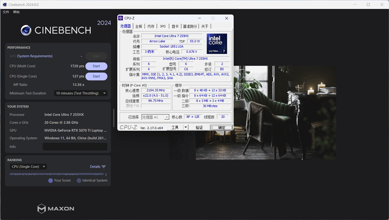 CINEBENCH 2024 test results: CPU scored 127pts in single-core performance and 1729pts in multi-core performance.