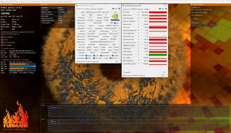 We used FurMark to conduct a burn-in test on the NVIDIA GeForce RTX 5070Ti Laptop GPU of the Colorful Jiangxing X16 Pro notebook. It can be seen that during the burn-in test, the GPU maintained a stable power release of 140W, with a core frequency of 2017MHz and a core temperature of 73.8 degrees Celsius.