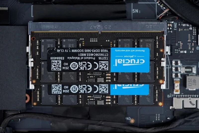 The Colorful Jiangxing X16 Pro laptop comes pre-installed with two Micron DDR5 5600 memory modules, totaling 32GB of capacity.