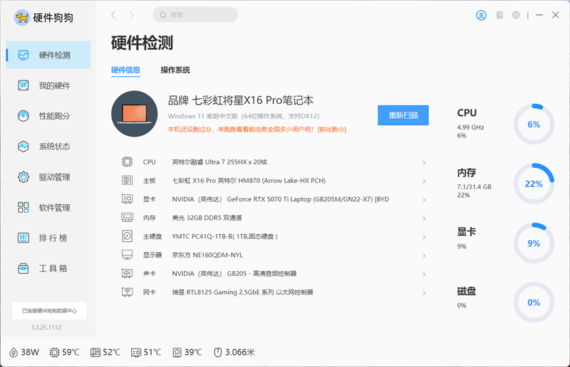 The Colorful Jiangxing X16 Pro laptop we received is equipped with an Intel Core Ultra 7 255HX processor and an NVIDIA GeForce RTX 5070Ti Laptop GPU, paired with 32GB of DDR5-5600 memory and a 1TB PCIe 4.0 SSD. Given the current surge in memory prices, the laptop comes with maximum memory capacity, eliminating the need for user upgrades.