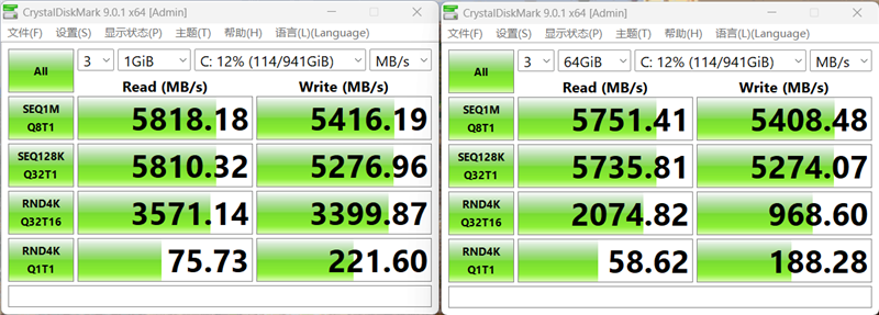 The Colorful Jiangxing X16 Pro laptop's built-in Yangtze River Storage PC41Q 1TB SSD achieved sequential read and write speeds of 5818MB/s and 5416MB/s, respectively, in the CrystalDiskMark test, with 4K read and write speeds reaching 75MB/s and 221MB/s.