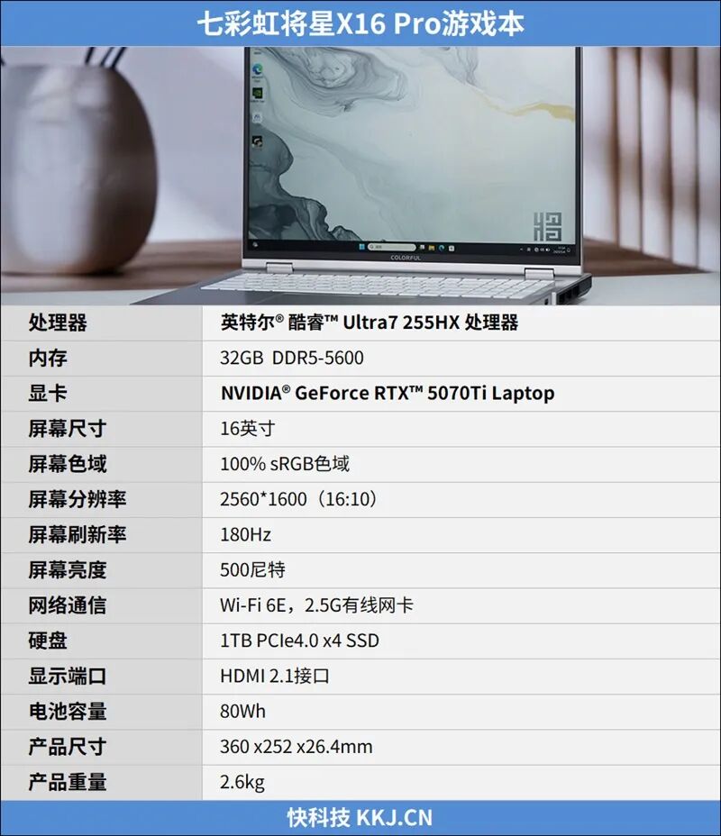 The Colorful Jiangxing X16 Pro laptop features a 16-inch screen with a resolution of 2560x1600, a 16:10 aspect ratio, and a refresh rate of up to 180Hz, covering the full sRGB color space.
