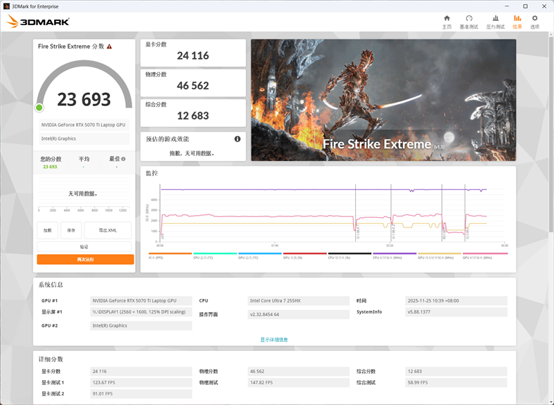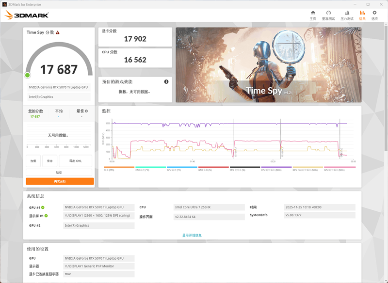 The NVIDIA GeForce RTX 5070Ti Laptop graphics card equipped in the Colorful Jiangxing X16 Pro laptop scored 17902 and 8402 in the 3Dmark Time Spy test.