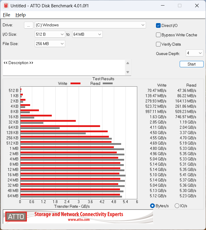 In the ATTO Disk Benchmark test, the Yangtze River Storage PC41Q 1TB SSD's 0.5K small file read and write speeds reached 47.36MB/s and 70.47MB/s, respectively, with read and write speeds exceeding 1GB/s starting from 16K, and reaching maximum speeds of over 4.5GB/s for writes and over 5GB/s for reads from 256K onwards.