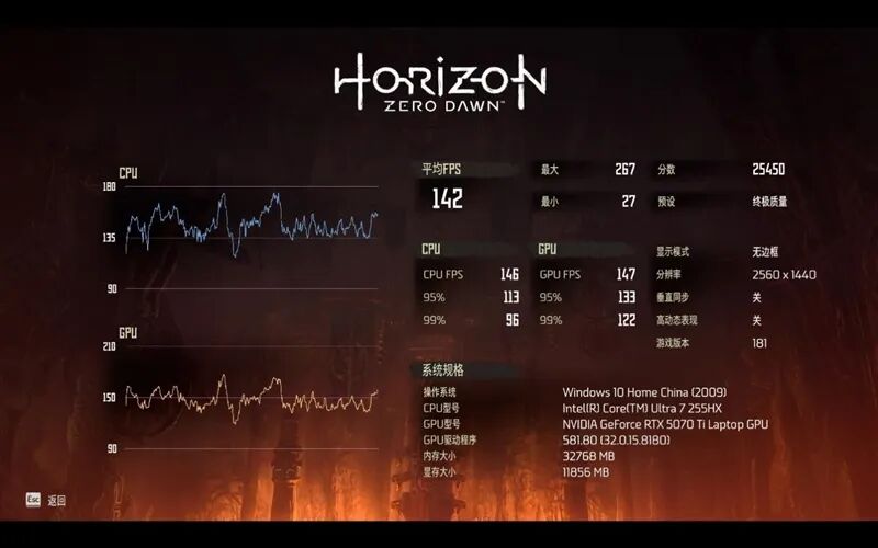 In Horizon Zero Dawn, using ultimate quality settings at 2K resolution, the final test result was 142fps.