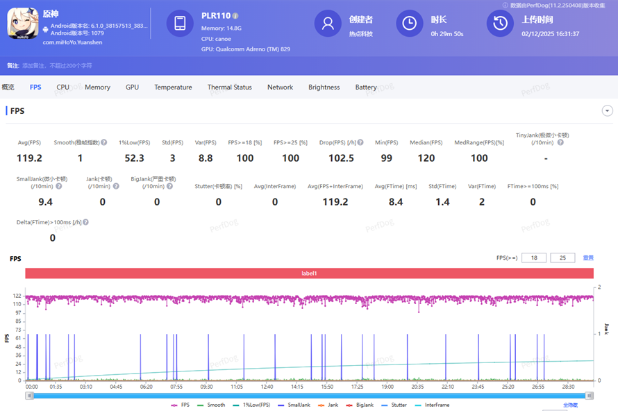 In addition to the 165 high frame rate gaming experience, the OnePlus Ace 6T supports super-frame gaming. For example, in Genshin Impact, after enabling the highest graphics quality and 60 frames mode, the super-frame experience can be activated in the mobile game assistant, providing a direct 120 frames Genshin Impact experience. Testing showed an average gaming frame rate of 119.2 frames.