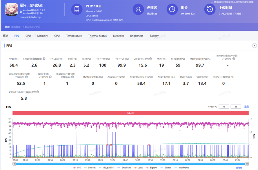 The OnePlus Ace 6T achieved an average gaming frame rate of 58.4 frames, with a 1% low frame rate of 26.8 frames. Although the frame rate fluctuated, it generally hovered around 60 frames, providing a relatively smooth gaming experience. Compared to previously tested Snapdragon 8 Supreme models, the frame rate trend was much more stable.