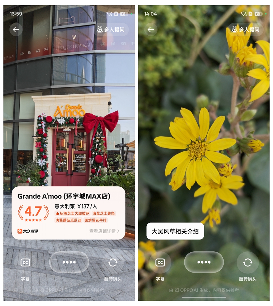 There are also many newly added AI functions. For example, waking up the Xiao Bu assistant allows direct access to the camera for real-time shooting, obtaining information about the scene through real-time dialogue. It's like the assistant is 'seeing' and then using AI models to analyze and organize the content, whether it's plants you don't recognize, English menus, or even stores you're hesitant to enter—a glance can provide a rating.