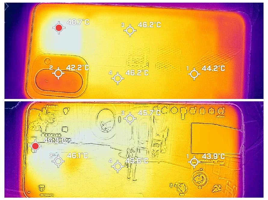 After 30 minutes of gaming, the phone's temperature was measured using an infrared thermometer. The back reached 48.7°C, while the front reached 46.3°C.