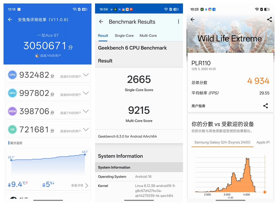 In theoretical performance tests, the OnePlus Ace 6T scored 3.05 million points in AnTuTu, 2,665 points in single-core and 9,215 points in multi-core tests on GeekBench 6 (which focuses on CPU performance), and 4,934 points in 3D Mark Wild Life Extreme (which emphasizes GPU performance). Its performance is slightly weaker than the Snapdragon 8 Supreme.