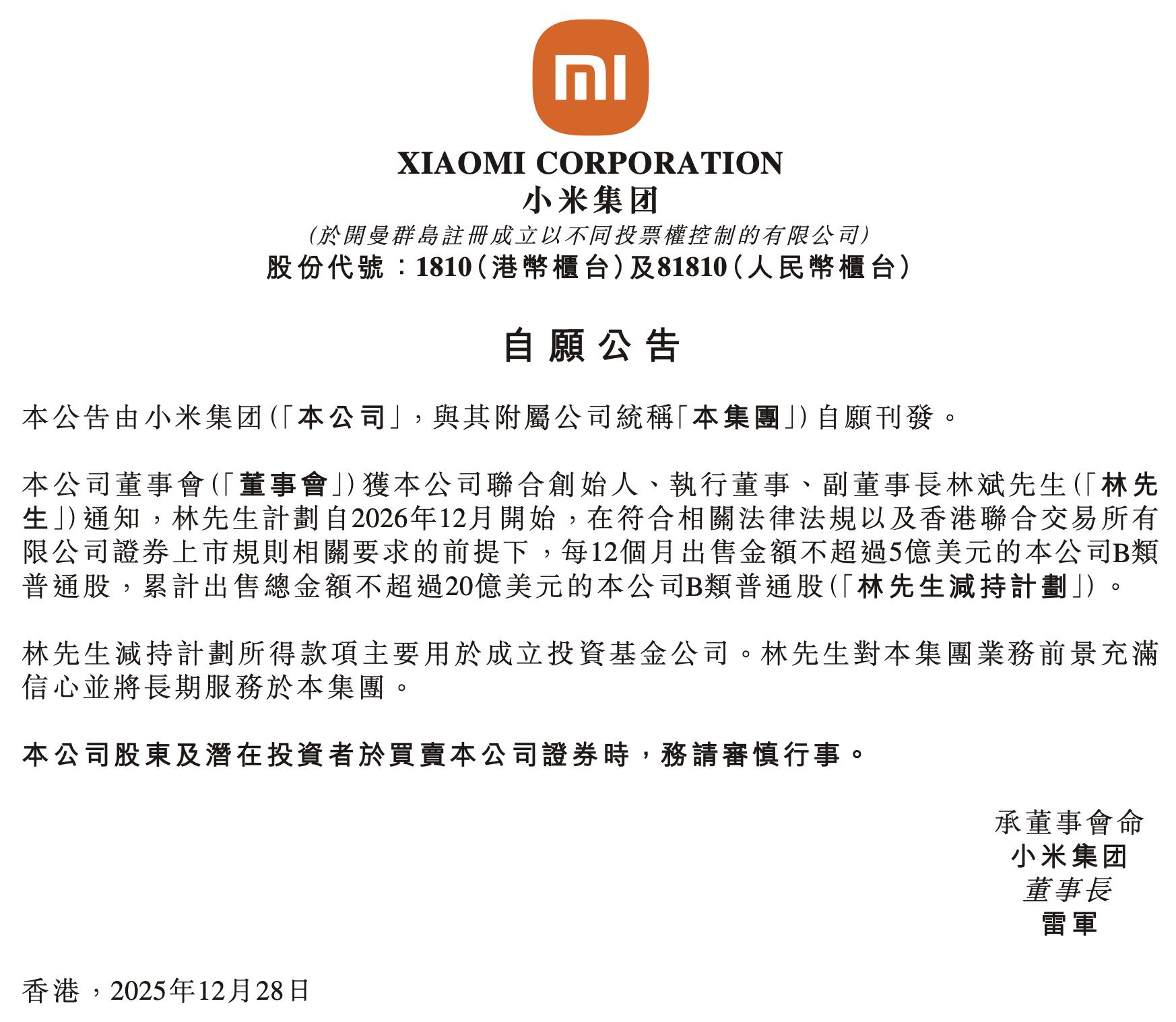 On December 28, 2025, Xiaomi Group made an announcement that caught the market's eye. Co-founder and Vice Chairman Lin Bin revealed plans to sell up to $500 million worth of Class B ordinary shares every 12 months, starting from December 2026, with a cumulative cap of $2 billion. The proceeds from these sales will primarily be channeled into setting up an investment fund company.