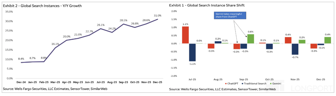 Regarding AI's substitutive impact on traditional search, Google has held its ground with the powerful Gemini 3 (significantly slowing ChatGPT's market share gains), currently enjoying a Dividend period [dividend period] of user migration before a complete collapse—driving improved overall search user experience, with user search queries accelerating over the past year.