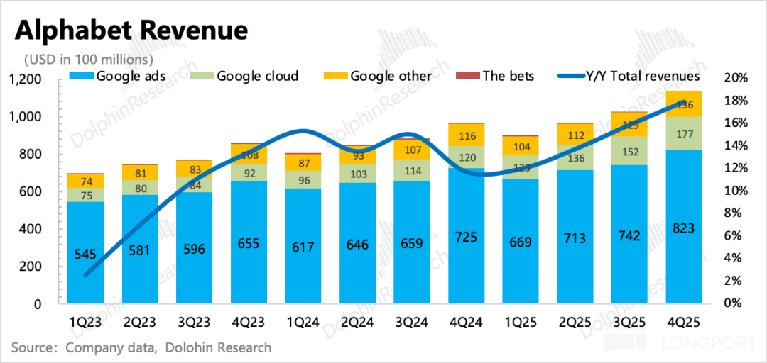 In Q4, Google's total revenue reached $113.8 billion, up 18% year-over-year (with a 1pct tailwind from currency exchange), exceeding consensus expectations. The core pillar, advertising, accounting for 70%, grew 13.6% year-over-year, accelerating sequentially, while cloud business performance was even more 'outstanding.'