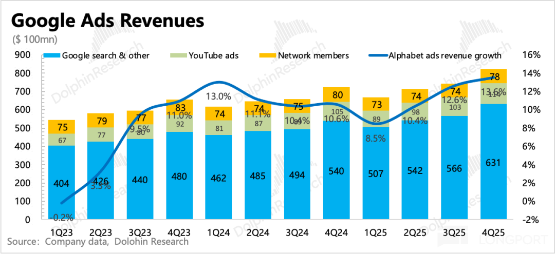 (2) YouTube unexpectedly weakened: Q4 ad growth on the platform fell below 9%, significantly lower than the consensus expectation of 12-13%, unable to withstand last year's high base pressure. Dolphin Research believes this is likely due to internal cannibalization from Shorts (which has yet to aggressively monetize) and unexpected pressure on YouTube TV's brand advertising.