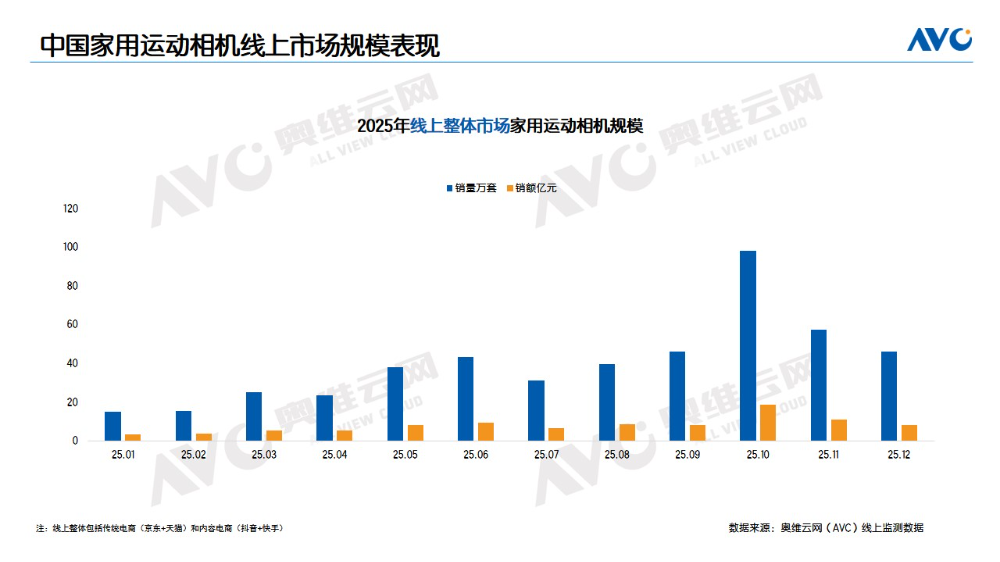 In 2025, China's online sports camera market continues its rapid growth trajectory. According to online monitoring data from AVC (All View Cloud), the total online retail volume of household sports cameras in China (including JD.com, Tmall, Suning, Douyin, and Kuaishou) reached 4.78 million units in 2025, marking a year-on-year increase of 232%. Retail revenue hit RMB 9.71 billion, up 223% year-on-year. This growth is not a fleeting trend but the inevitable result of multiple overlapping factors.