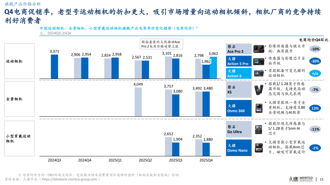 Leading brands have established a strong market presence around their flagship models but are also engaging in direct price competition. This is reflected in data showing that in Q4 2025 and beyond, these companies offered deeper discounts on flagship models during e-commerce promotions. Additionally, the launch of new small wearable cameras created internal competition within the same brand across different product forms.