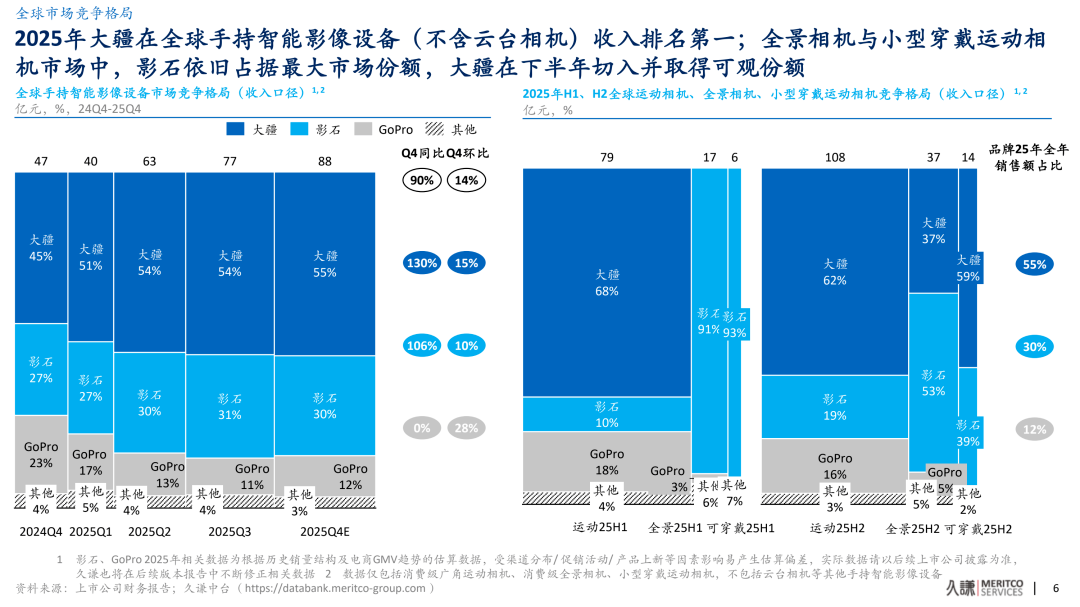 Jiutian's research shows that Insta360 holds a clear advantage in the panoramic and wearable camera segments while gaining share in action cameras, reaching an overall market share of around 30%, ranking second globally.