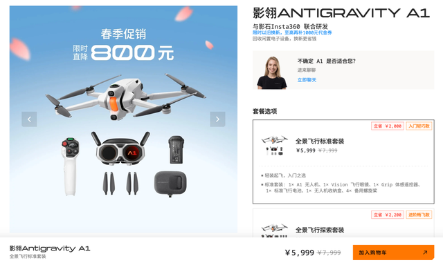 In late 2025, Insta360 launched its flagship product, the panoramic drone Yingling Antigravity A1. However, after just three months on the market, the full-system kit began offering discounts, with the original 7,999 RMB standard kit reduced to 5,999 RMB.