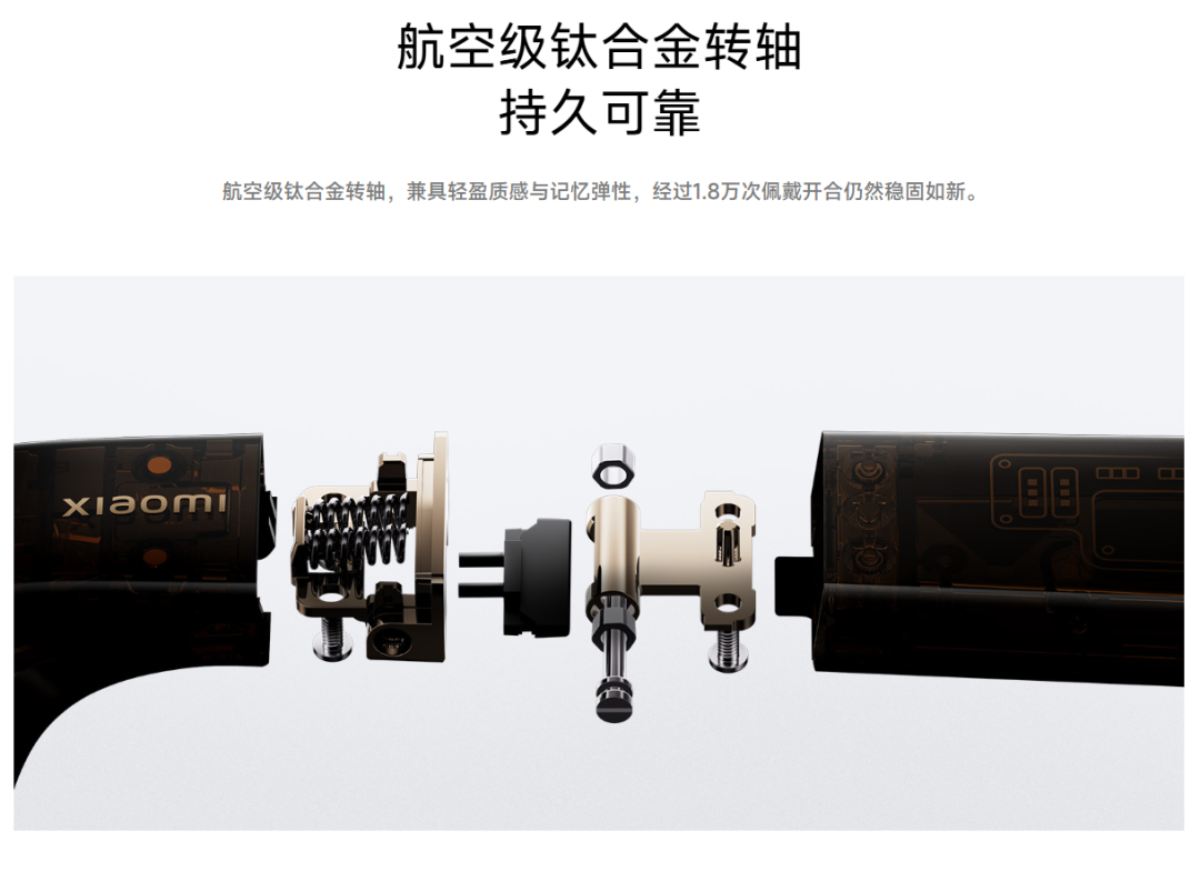 Xiaomi officially provided a specific figure: 18,000 opening and closing cycles. Wearing and removing the glasses three times a day, 18,000 cycles means a usage period of over 16 years. This is a very high requirement for a structural component and is the design goal of the titanium alloy + spring hinge solution.