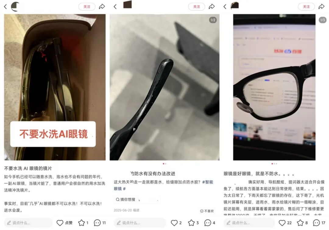 Jingzhe Research Institute also notes that AI glasses, as digital products with multiple electronic components used around-the-clock (around-the-clock), often have subpar waterproofing. On Xiaohongshu, users report AI glasses damaged by rain or water washing, with lens malfunctions. Others worry about sweat seeping through temple joints during prolonged use.